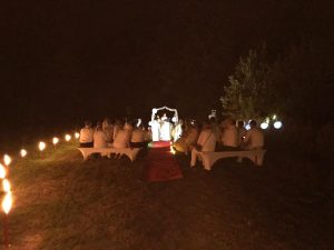 …eine laue Sommernacht, ein altes Herrschaftsgelände mit geschichtsträchtigen Gebäuden, die mächtige ehrwürdige Bäume auf großen Wiesen einrahmen..Ein umwerfendes Paar voller Ideen, das seinen Großen Tag nicht wie alle anderen, sondern ganz anders feiern wollte: Am Abend im Fackelschein! Dies waren die „Zutaten“ für eine ganz besondere Lebensfeier anlässlich der Silberhochzeit zu der ein neuerliches „Ja“ zur Überraschung der Gäste in einer Freie Lebensfeier, die ich gemeinsam mit meinem Pianisten Holger Miersch in Wort und Musik gestalten durfte, anstand. Na, das ist doch was für mich! Die Sterne höchstselbst strahlten mit unser aller Begeisterung um die Wette. Die Augen unser beider Hauptpersonen des Tages glitzerten im Schein der vielen Lichter und deren Gäste steuerten mit tausend guten Wünschen zur Ringzeremonie auch ein Feuerwerk der Herzenswärme bei. Wuuuuunderschöööön!