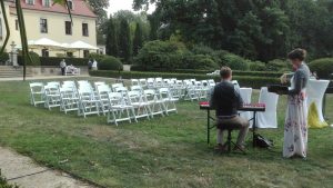 Eine kleine angedeutete „Freie Trauung“ kredenzen mein Pianist und ich Ihnen in Wort und Musik auf dem lauschigen Elbbalkon des herrschaftlichen Anwesens.