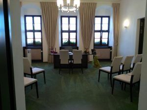 ..ein heller schöner und gemütlicher Raum. Ein luftiger Vorraum dazu, in dem von der netten Standesbeamtin bereits die Stehtische behusst, Knabberei sowie Deko bereit- und der Sekt samt Gläser kühl gestellt worden waren. Die Hochzeitskerze, die ich für unser Paar basteln durfte, der Pianist Andreas Leuschner, den ich mir für die großartige Klaviertechnische Hilfe an meiner Seite für den Großen Tag „geschnappt“ hatte, die Standesbeamtin, der Fotograf und ich…alles stand/alle standen bereit. Die Gäste wurden in den Raum geführt und der stolze Bräutigam mit seiner wunderschönen Braut im Arm betrat die Traulokalität. Wie hübsch Sie beide aussahen, mein liebes Paar! Da sah ich ein großes Glück in Ihrer beider Augen…Die übergroße Erwartung an den anderen; der Druck, der über der Sorge entsteht, was die anderen wohl denken: Egal, alles egal… Für solche lapidaren Sorgen, die einem nur den Tag vermiesen, hatten Sie nun wirklich keine Zeit, stimmts?…Sie haben den Tag geatmet und jeden Augenblick genossen. So sieht ein gelungener Hochzeitstag eines tollen Paares aus!
