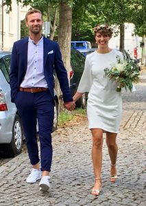 …Blicke die vor Lebenslust sprühen, Schwung der aus der Freude des Augenblicks kommt und ein Lächeln das gut und gerne mit dem Glanz der Sonnenstrahlen mithalten kann: So kam unser süßes Paar zu dessen Trauung daher. Ziel war ein ganz besonders ehrwürdiges Haus mit weißen Fensterläden vor den mannshohen edel geschwungenen Fenstern, durch die das Licht weich und golden hereinfiel. Die Standesbeamtin sprach sonnige Worte und Moritz Töpfer und ich durften dieses Mal deren Rede mit den Wunschliedern unseres Paares in Klavier und Gesang umrahmen.