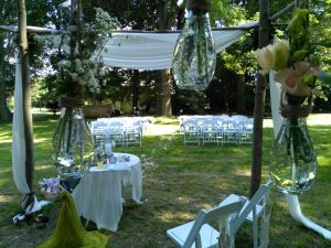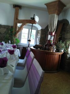 So glitzerten Braut und Bräutigam also mit den warmen Sonnenstrahlen um die Wette, als sie mit den Gästen unter dem Gesang eines hell klingenden Männerchores das geschmackvolle Ambiente betraten. Die liebevoll restaurierte Location, die Deko im Raum…alles gab einen würdigen Rahmen und die gefühlvolle Rede der Standesbeamtin sowie meine für die beiden gesungenen Lieblingslieder „machten den Bogen rund“.