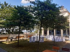 …von der Elbe her ertönte ab und an ein freundliches „Tuuuut“ von einem der Dampfer, die an diesem heißen Tag Massen von Touristen auf dem Fluß transportierten. Auf dem Wasser wehte sicherlich ein kleines Lüftchen, das von vielen hier oben, 70 m über dem Wasserspiegel arg herbeigesehnt wurde. 34 Grad, das Schloss zu Pirna mit seinen schönen Terrassen – beeindruckende Bauten, die den Reichtum der damaligen Besitzer erahnen lassen und der Schatten der sorgsam bepflanzten Fläche vor dem festlich geschmückten edlen Feierraum, der scheinbar ohne Absatz in die Außen-Terrasse übergeht. So präsentierte sich die schicke Location unserem schönen Paar und deren Gästen. Im flirrenden Sonnenlicht betrat die schöne Braut wie eine Fee den luftigen Trauraum. Mit Musik von Moritz Töpfer am Klavier empfangen und mit Worten, die unserem Paar schier auf den Leib geschneidert und die dessen Geschichte erzählte, sowie mit Liedern, die als Herzenslieder mit viel Liebe ausgewählt wurden, füllte sich die Zeremonie und der Ort des Geschehens wie mit einem schönen Parfum. Die Ringe wurden, untermalt von leisen Pianoklängen, durch die Hände aller Gäste gereicht und kamen angefüllt mit den guten Wünschen bei Braut und Bräutigam an. Nach ein paar gefühlvoll gewählten persönlichen Worten, die die beiden aneinander richteten, wurden die Eheringe angesteckt. Unter herzlichem Applaus und mit einem Kuss besiegelt, mit einem Glas Sekt begossen, wurde dem jungen Paar nach dem Auszug, nur ein paar Schritte entfernt, an edel behussten Stehtischen, gratuliert. Welch ein großes Glück!